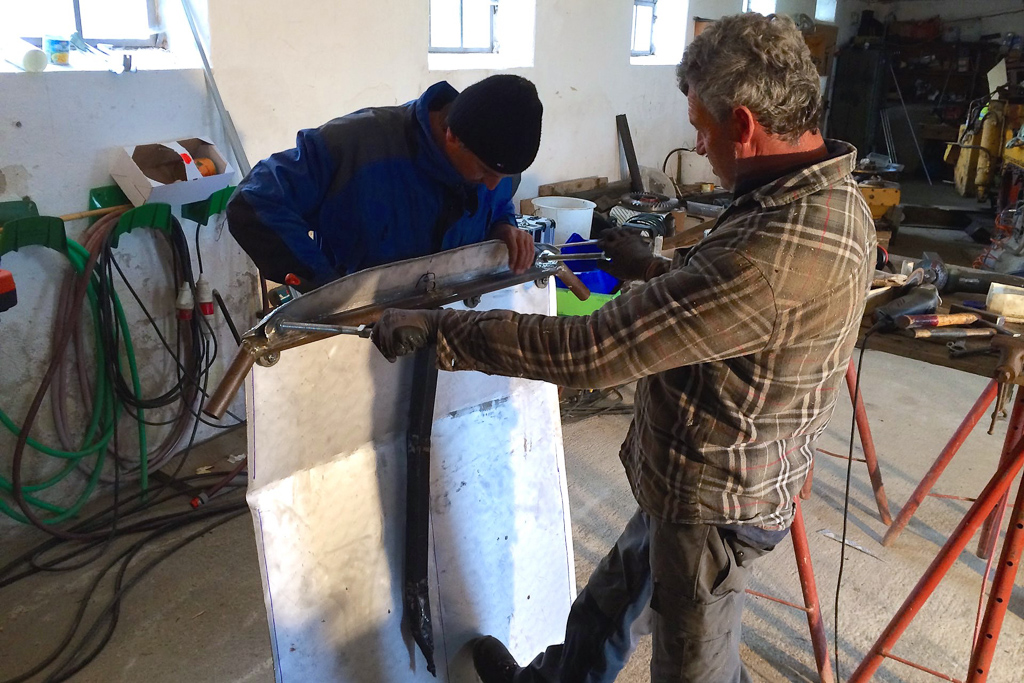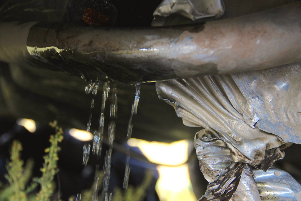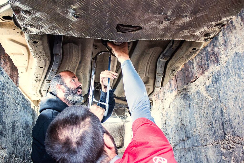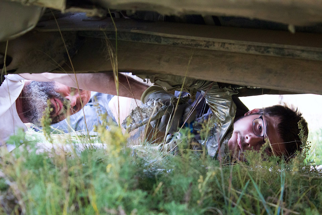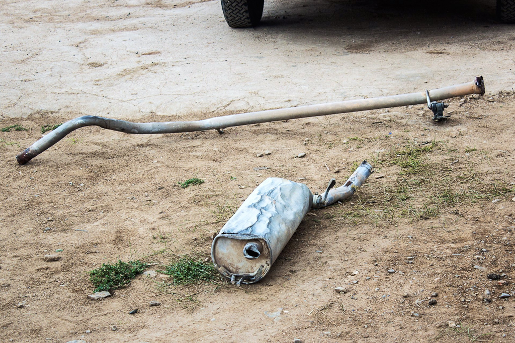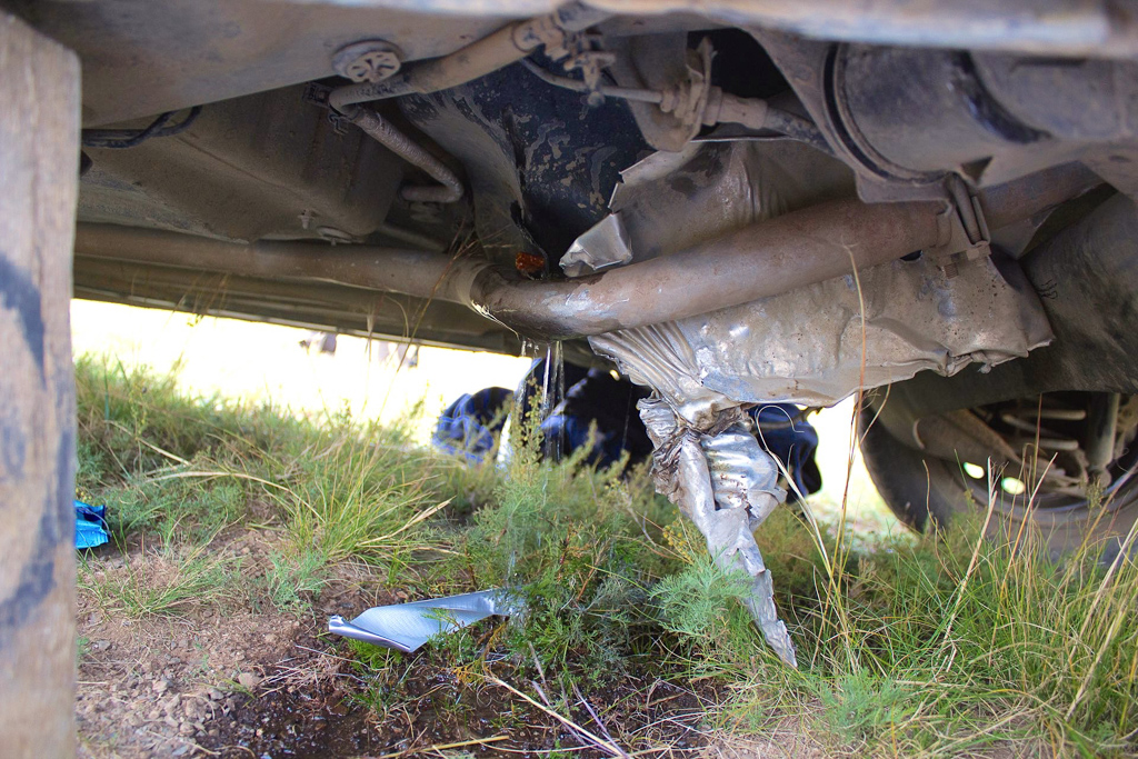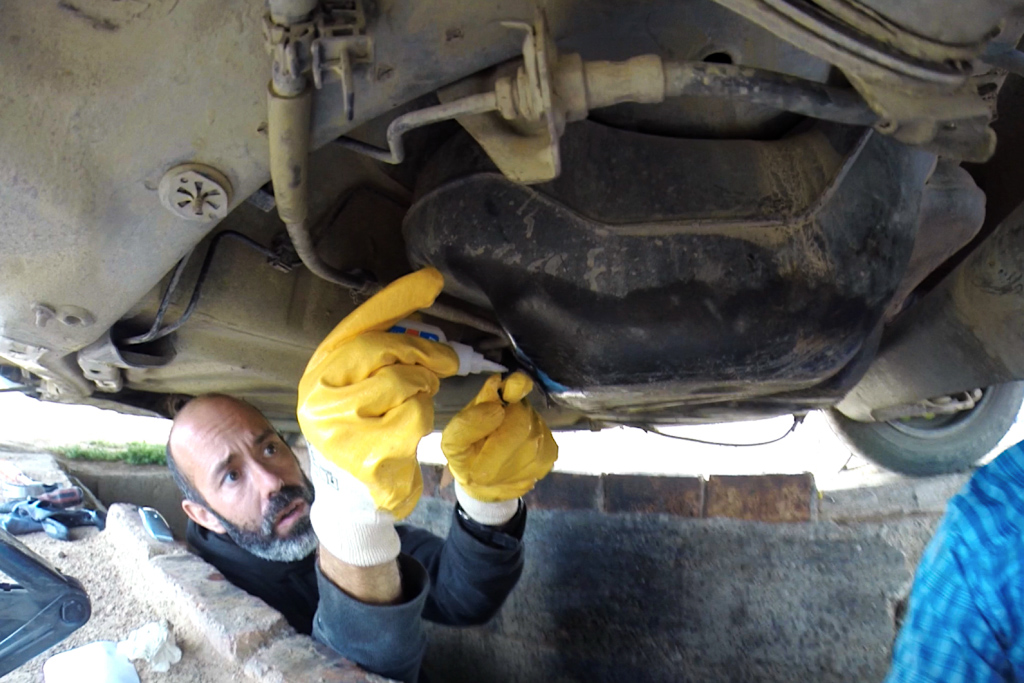 Mit vereinten Kräften rissen wir den Auspuff komplett ab dem Katalysator ab, um an den kaputten Tank zu kommen. Den verklebten wir dann mit Gaffaband und Stoffhandschuhen, in der Hoffnung, dass das hält. Und es hielt wirklich!