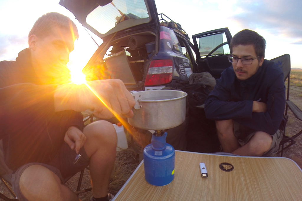 Zu diesem Zeitpunkt konnten wir nicht's anders mehr machen als warten, bis der gesamte Benzin ausgelaufen war. Bereits durch die vergangenen 4 Wochen abgehärtet liessen wir uns von dieser kleinen Macke an Bruno nicht aus der Ruhe bringen - sondern eher durch die Diskussion, welche Art von Nudeln wir nun zum Abendessen kochen würden.