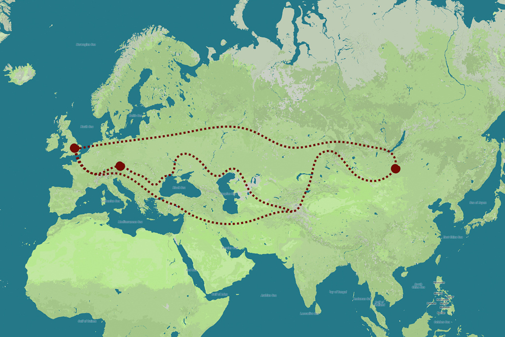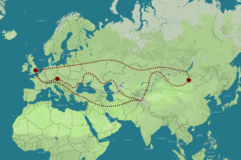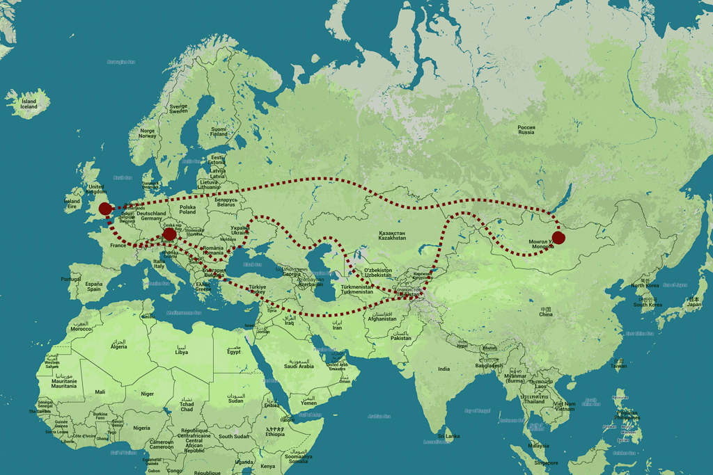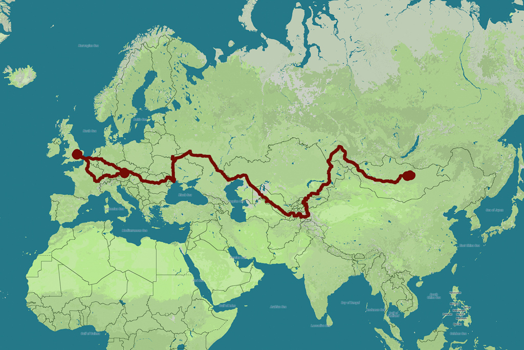 Route: Links London, in der Mitte Tragwein, rechts Ulaanbaatar